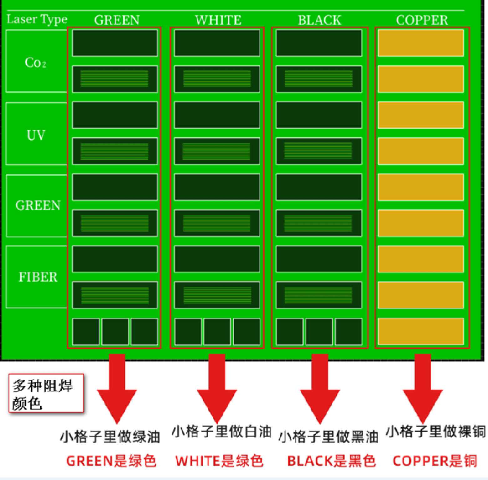 在客户给出准确的要求后,可以定制多色阻焊制作,工程人员可以细心来处理多色阻焊资料,做出多种阻焊颜色的效果 示意图