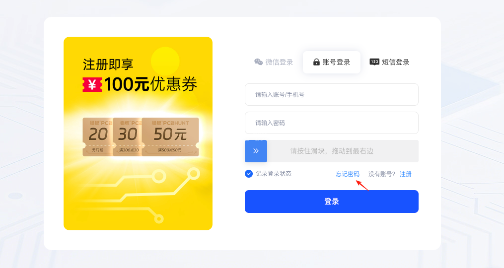 一、打开猎板PCB首页 www.pcbhunt.com 点击右上角【登录】按钮进入登录页面