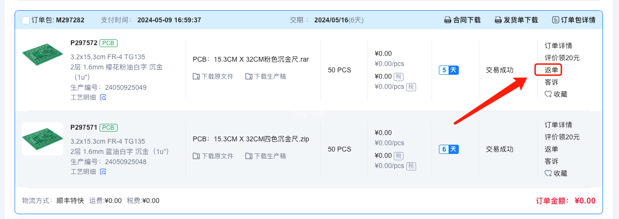 第一步:点击【已完成订单】下方“返单”按钮进入返单页面(只有订单确认收货后才支持返单);第二步:可选择报告类型、出货要求,支持对订单的部分参数进行修改,选择完成后输入返单片数,点击提交加入购物车;第三步:进入购物车进行结算;