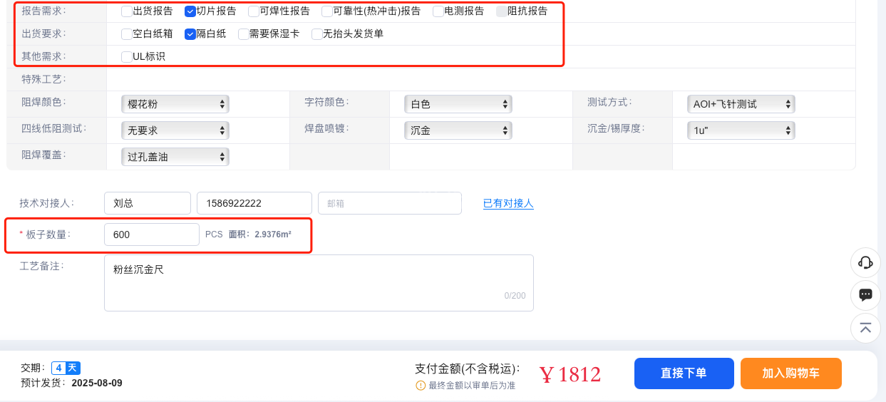 第二步:可选择报告类型、出货要求,支持对订单的部分参数进行修改,选择完成后输入返单片数,点击提交加入购物车;