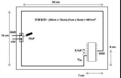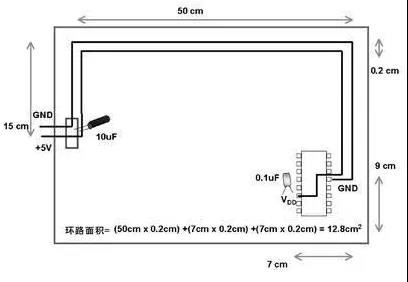 此电路板上,设计出的环路面积为697cm2。采用图3所示的方法,电路板上或电路板外的辐射噪声在环路中感应电压的可能性可大为降低。