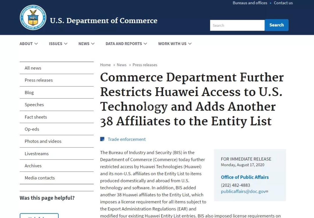 美国商务部工业和安全局(BIS)进一步升级对华为的封杀。北京时间8月17日晚,美国国务卿蓬佩奥在一份声明中表示,美国商务部进一步收紧了对华为获取美国技术的限制,同时将华为在全球21个国家的38家子公司列入“实体清单”。