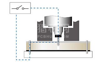 接触式断针侦测的原理,简单来说,就是判断刀具、工件与机台是否构成一个回路。当刀具正常时,刀尖可以碰触到板面(需为导电材质),如此便构成一个回路。但若发生断针时,刀具无法接触到板面,便无法构成回路。