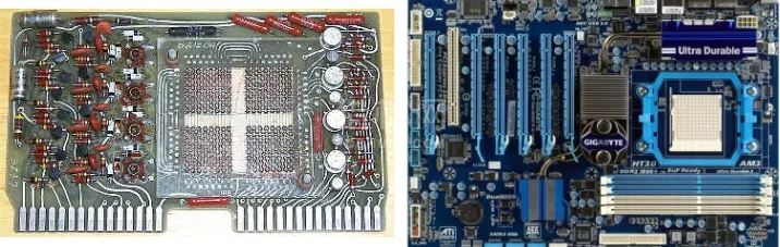 ▲ 对比1968年计算器中电路板和现代计算机主板
