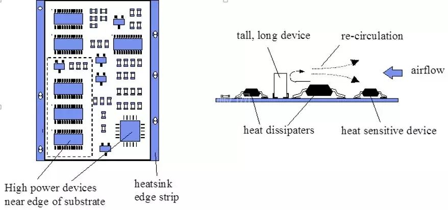 e、设备内印制板的散热主要依靠空气流动,所以在设计时要研究空气流动路径,合理配置器件或印制电路板。空气流动时总是趋向于阻力小的地方流动,所以在印制电路板上配置器件时,要避免在某个区域留有较大的空域。整机中多块印制电路板的配置也应注意同样的问题。