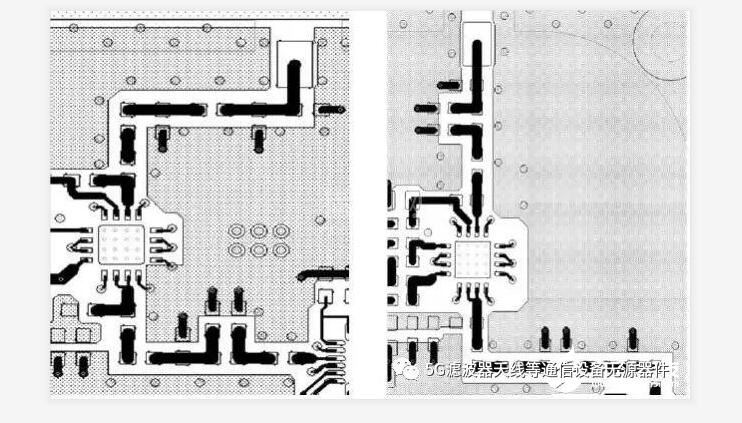 偏置电路的馈电电感与RF通道垂直放置,如图6所示,主要是为了避免感性器件之间的互感。