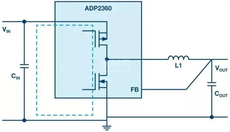 图 1. 用于降压转换的开关稳压器(带如虚线所示的关键热回路)。