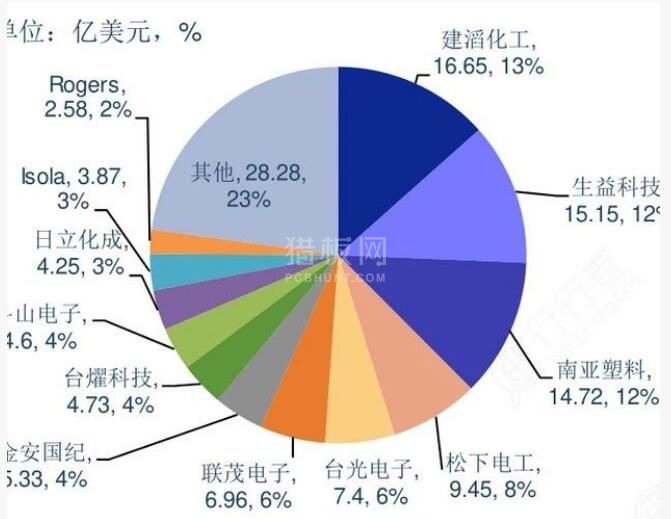 根据Prismark统计,全球前6大覆铜板厂商建滔化工、生益科技、南亚塑料、松下电工、台光电子和联茂电子市场占有率超过50%,前10大覆铜板厂商占比达到73.5%。