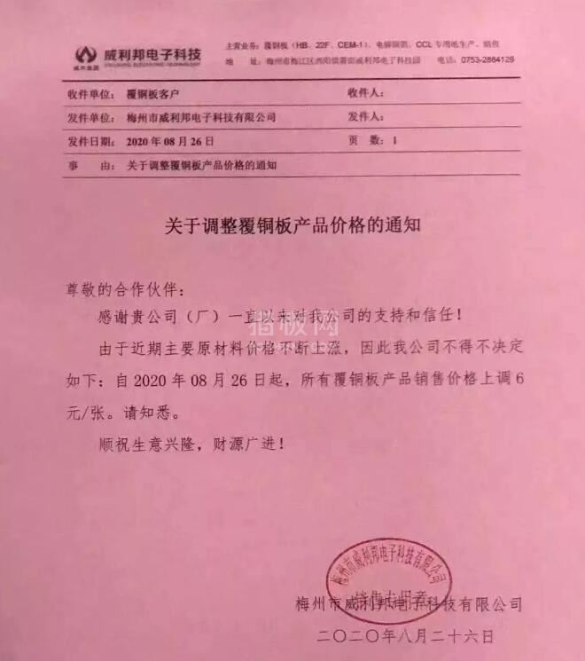 威利邦电子也在8月26日发出关于调整覆铜板产品价格的通知,表示因原材料价格涨势不断,公司不得不决定自26日起所有覆铜板产品销售价格上调6元/张: