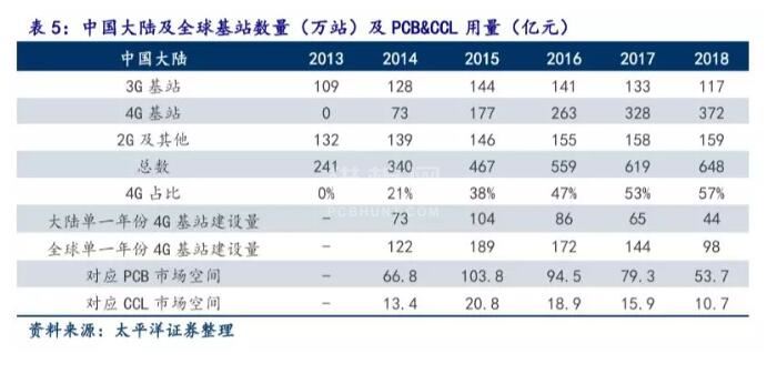截止2018年,中国大陆4G基站总量约为372万站,因中国4G进展快于全球平均,渗透率高于全球平均,非中国大陆地区后续4G基站建设力度和时间跨度将超过中国,则全球各年份4G基站建设用PCB市场空间约为40-80亿元。