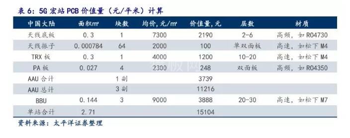 BBU尺寸与4G差异不大,一共3-5块板,尺寸0.48*0.3m,20-30层板,9000元/平米,松下M4M6M7等高速基材为主。