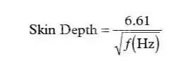在高频段,必须考虑一种称为“趋肤效应”的现象。趋肤效应会引起电流流向导线的外表面——结果会使得导线的横截面变窄,因此使直流(DC)电阻增大。虽然趋肤效应超出了本文讨论的范围,这里还是给出铜线中趋肤深度(Skin Depth)的一个很好的近似公式(以cm为单位):