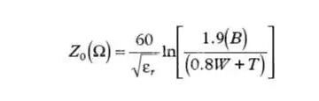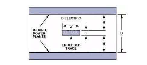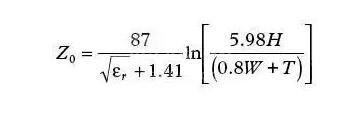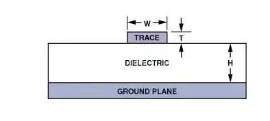 H表示从接地平面到信号印制线之间的距离,W表示印制线宽度,T表示印制线厚度;全部尺寸均以密耳(mils)(10-3英寸)为单位。εr表示PCB材料的介电常数。