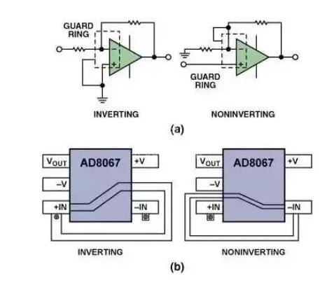 图15(a)示出了用于运算放大器反相配置和同相配置中的保护环的原理图。图15(b)示出用于SOT-23-5封装中两种保护环的典型布线方法。