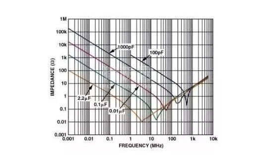 图1示出了采用多个并联电容器的优点。在低频段,大的电容器提供低阻抗的接地通路。但是一旦频率达到了它们自身的谐振频率,电容器的容性就会减弱,并且逐渐呈现出感性。这就是为什么采用多个电容器是很重要的原因:当一个电容器的频率响应开始下降时,另一个电容器的频率响应开始其作用,所以能在许多十倍频程范围内保持很低的AC阻抗。