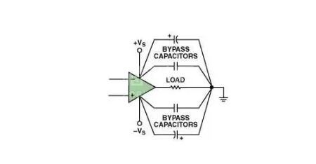 电源端接地:这种方法在大多数情况下都是最有效的,采用多个并联电容器将运算放大器的电源引脚直接接地。一般说来两个并联电容就足够了——但是增加并联电容器可能给某些电路带来益处。