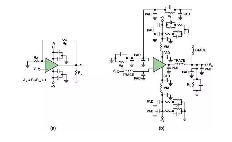所谓寄生效应就是那些溜进你的PCB并在电路中大施破坏、头痛令人、原因不明的小故障(按照字面意思)。它们就是渗入高速电路中隐藏的寄生电容和寄生电感。其中包括由封装引脚和印制线过长形成的寄生电感;焊盘到地、焊盘到电源平面和焊盘到印制线之间形成的寄生电容;通孔之间的相互影响,以及许多其它可能的寄生效应。图3(a)示出了一个典型的同相运算放大器原理图。但是,如果考虑寄生效应的话,同样的电路可能会变成图3(b)那样。