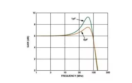 在高速电路中,很小的值就会影响电路的性能。有时候几十个皮法(pF)的电容就足够了。相关实例:如果在反相输入端仅有1 pF的附加寄生电容,它在频率域可以引起差不多2 dB的尖脉冲(见图4)。如果寄生电容足够大的话,它会引起电路的不稳定和振荡。