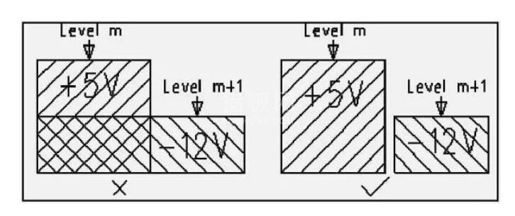 (d)如若在相邻平面处理电源,要尽量避免铜皮或者走线平行处理。主要是为了减少不同电源之间的干扰,特别是一些电压相差很大的电源之间,电源平面的重叠问题一定要设法避免,难以避免时可考虑中间隔地层。
