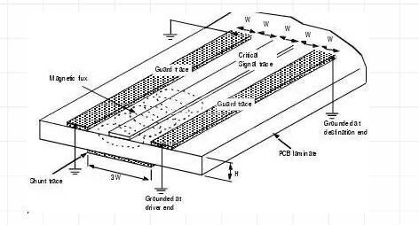 保护线路不仅隔离了由其他信号线上产生的耦合磁通,而且也将关键信号从与其他信号线的耦合中隔离开来。分流线路和保护线路之间的不同之处在于分流线路不必被端接(与地连接),但是保护线路的两端都必须连接到地。为了进一步的减少耦合,多层PCB中的保护线路可以每隔一段就加上到地的通路。
