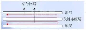 1、关键布线层(时钟线、总线、接口信号线、射频线、复位信号线、片选信号线以及各种控制信号线等所在层)应与完整地平面相邻,优选两地平面之间,如图1所示。关键信号线一般都是强辐射或极其敏感的信号线,靠近地平面布线能够使其信号回路面积减小,减小其辐射强度或提高抗干扰能力。