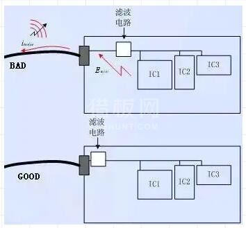 3、线路板电源输入口的滤波电路应应靠近接口放置,避免已经经过了滤波的线路被再次耦合。
