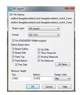 系统需要能够以与 DXF 参数设置类似的方式,来控制 IDF 文件中将包含的内容,如图 6 中所示。如果某些元器件没有高度信息,IDF 导出能够在创建过程中添加缺少的信息。