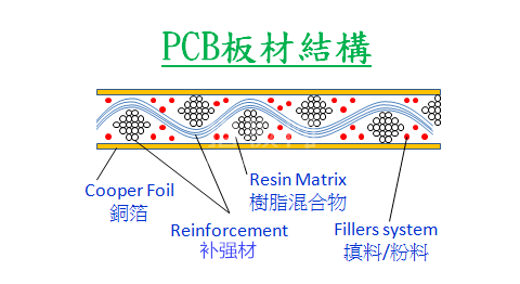 现今的PCB基材大底由铜箔层(Cooper Foil)、补强材(Reinforcement)、树脂(Epoxy)等三种主要成份所构成,可是自从无铅(Lead Free)制程开始后,第四项粉料(Fillers)才被大量加进PCB的板材中,用以提高PCB的耐热能力。