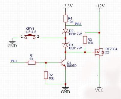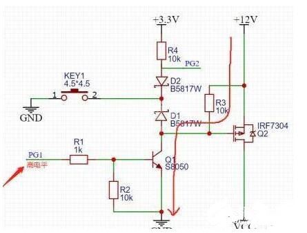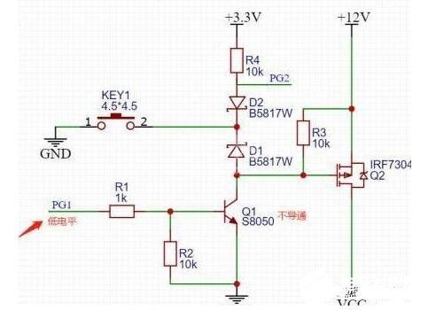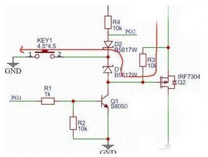 按键没按下之前,PMOSGS两端电压一样,不导通,当按键按下之后,看上图红色回路,G极通过二极管D1接地,PMOS导通,12V电压通过PMOS到VCC,给后级供电,这时候有老铁就要问了,难道我要一直按着嘛,按键松开的话MOS不就关断了
