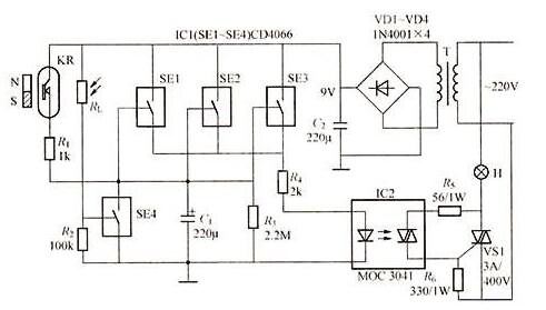 电路中的RL及R2和SE4构成光控电路。白天,光敏电阻RL阻值较小,使SE4关闭,SE1~SE3的控制端处于低电平,因而无法闭合,灯H自然不会点亮。夜晚时,RL的阻值增大,SE4断开,解除了光控作用。