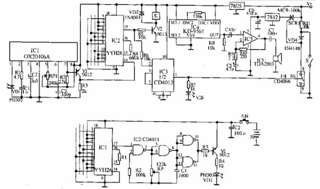 发射电路:CD4011组成的40kHz振荡器经9012推动红外线发射管送出YYH26的编码内容。接收端在解码正确时由IC2的17脚输出高电平,经9013驱动继电器打开门锁。关门后安装在门上的控制开关S‘闭合,可控硅的控制极处于低电位而截止。当强行打开门时,可控硅导通,此时即使闭上门由于VD4的隔离作用使可控硅继续处于导通状态,报警器仍然工作。当用遥控器开门时,IC2的17脚除推动9013开门外,还加到由IC3组成的双稳态电路,使其1脚输出高电平使IC6(CD4066)的电子开关S闭合,通过可控硅使报警电路不工作。发光二极管VD3指示电路的工作状态,其熄灭时为警戒状态,点亮时为解锁。
