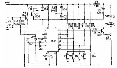 发射电路:当按下任一按。键时,电源经VD2或VD4使。V1、V2导通,集成电路得。电,8801的9脚相应地输出--脉冲串,经V3、V4驱动,由红外发射管VII、VI2辐射出去。