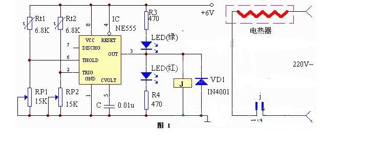 恒温控制器由热敏电阻Rt1、Rt2、NE555时基电路、温度范围调整电阻RP1、RP2及控制执行机构组成,电路如图1所示。Rt1、RP1为上限温度检测电阻,Rt2、RP2为下限温度检测电阻。当温度下降时,②脚电位低于1/3Vcc时,③脚输出高电平,J吸合,LED2点亮,开始加热。当温度升高而使IC⑥脚电位高于2/3Vcc时,③脚输出低电平,J释放,断开受控“电热器”的电源,停止加热。