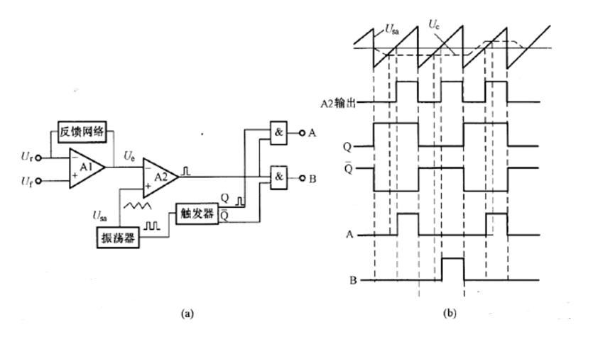 开关电源他激控制方式有脉宽调制(PWM)和脉频调制(PFM),其中,大部分都采用PWM方式,因此,现简介PWM控制原理。图所示为PWM信号产生电路框图及工作波形,其工作过程如下:对被控制电压Uo。进行检测所得的反馈电压Ur加至放大器Al的同相输入端,固定的参考电压Uo加至A1的反相输入端。经A1放大后的直流误差电压Ue加至比较器A2的反相输入端,由固定频率振荡器产生的锯齿波信号Usa加至A2的同相输入端。A2输出方波信号,其占空比随误差电压而变化,即实现了脉宽调制。对于单管变换器,A2输出的PWM信号即可作为控制功率晶体管的开关信号,对于推挽或桥式等功率变换电路,则应将PWM信号分为两组信号,即分相。分相电路由触发器及两个“与”门组成,触发器的时钟信号对应于锯齿波的下降沿。A端和B端输出两组相差180°的PWM信号。