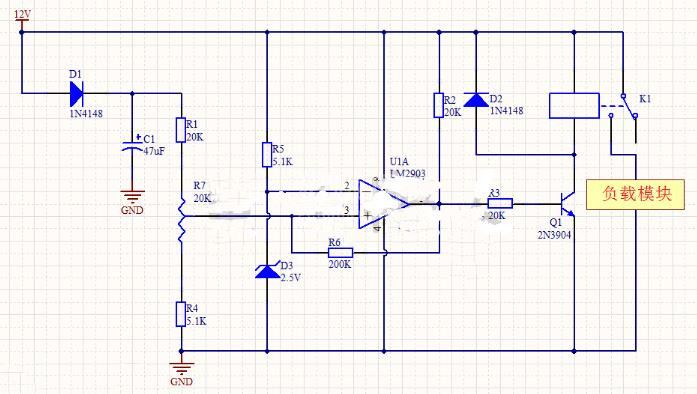 当电池电压下降到相应的门限时,继电器释放,负载模块电路失去电源;同时当电瓶电压充电上升到相应的门限时,继电器吸合,负载模块得电。从功能上看,与之前的电池过放保护电路非常相似。但本例是通过电阻正反馈来形成迟滞比较器的两个门限。具体过程请往下看