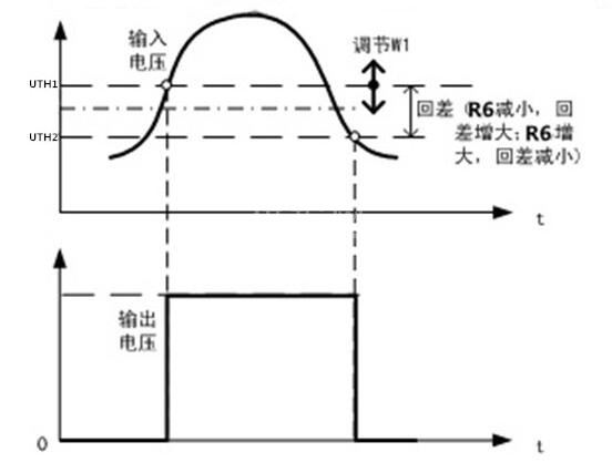 上限值和下限值的差,即UTH1-UTH2称为回差。通过上面对电阻R6的分析,大家应该知道如果要调整门限值,该怎么调节电路参数吧。其中R6阻值的大小,直接影响“并联”后的阻值,R6的阻值越大,“并联”后的电阻越接近原有的电阻值,即反馈影响就越小,回差越小;反之R6的阻值越小,回差越大。