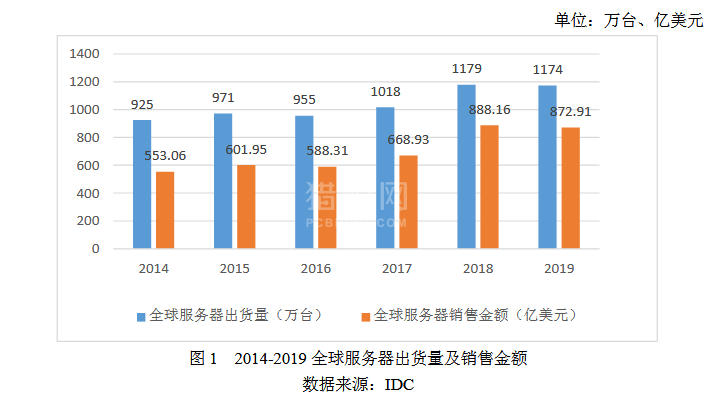 据IDC数据统计,2014年至2019年全球服务器出货量及销售金额稳步上升,2018年行业景气度相对较高,出货量和出货金额分别达1179万台和888.16亿美元,同比增长15.82%及32.77%,呈现量价齐升。2019年增长速度相对下降,但仍处于历史高位。2014年至2019年中国服务器行业快速发展,增长幅度超过全球其他地区。2019年出货量相对下滑,但销售金额同比相对上升,产品内部结构有所变化,平均单价有所上升,高端服务器销售比重呈现不断上升趋势。