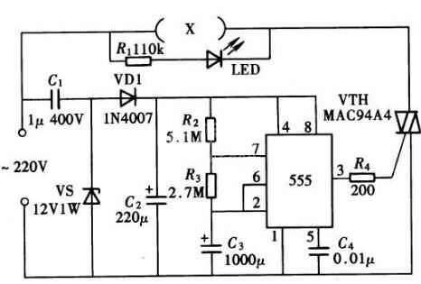 图中控制电路里,555时基电路接成周期为2h的多谐振荡器,3脚输出高电平时为1.5小时,此时可控硅ⅤTH导通,使插在X里电热灭蚊器通电工作,同时LED发光指示;3脚输出低电平的时间为0.5小时,此时VTH关断,灭蚊器停止工作,同时LED熄灭。