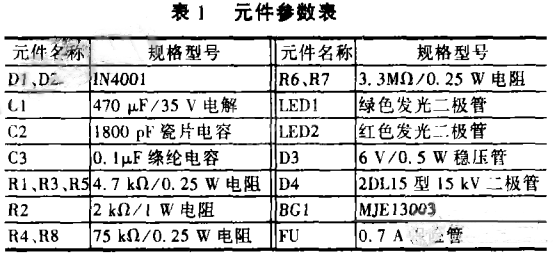 变压器T1次级输出电压为16.5v&TImes;2的43cm黑白电视机电源变压器;升压变压器用43cm黑白电视机高压包改制:原高压绕组保留下来作为高压输出绕组,用0.3mm的高强度漆包线在骨架上绕27匝作为初级绕组接在BGlc极与+20V电源上即可。放电极¨用一块10cm&TImes;10cm的环氧敷铜板用刀刻而成(放电极的距离应≥7.5mm或根据实际情况调整,以不拉火为宜)。其余元件按表1所列选择即可。