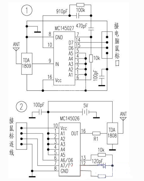 我们将鼠标连线割断,分别找出这4根线,利用MC145026编码电路的数据传送端D6和D7接受鼠标数据线1和数据线2传来的数据,并在芯片内部编码后经射频发射模块TDA1808发射出去。