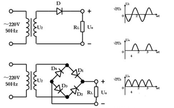 若设变压器副边电压u2=U2sinwt,U2为其有效值。当u2为正半周时,电流由a点流出,经Dl、RL、D3流入b点,因而负载电阻RL上的电压等于变压器副边电压,即uo=u2,D2和D4管承受的反向电压为一u2。当u2为负半周时,电流由b点流出,经D2、RL、D4流入a点,负载电阻RL上的电压等于一u2,即uo=一u2,D1、D3承受的反向电压为u2。这样,由于D1、D3和D2、D4两对二极管交替导通,致使负载电阻RL上在u2的整个周期内都有电流通过,而且方向不变,则输出电压uo=|U2sinwt|。