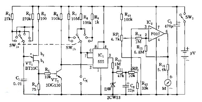 此输出脉冲经平滑滤波器R11、C2滤波后,经IC2(F007)直流放大后,使表头M的刻度值满偏(通过调节RP2实现)。同样调节其他各档,使555第3脚输出的方波的占空系数约为33%。即由R7(或R8、R9)和Cx决定的时间常数是VT1张弛振荡器脉冲周期的33%。DW稳压二极管用于对输出脉冲箝位,R11、C2用于滤波(积分),使C2上的电压与脉宽成比例,然后经IC2放大后驱动表头。R16用来对表头满偏进行限流。