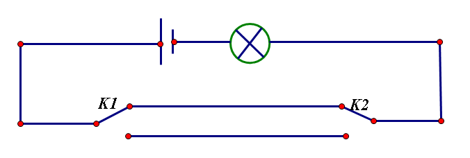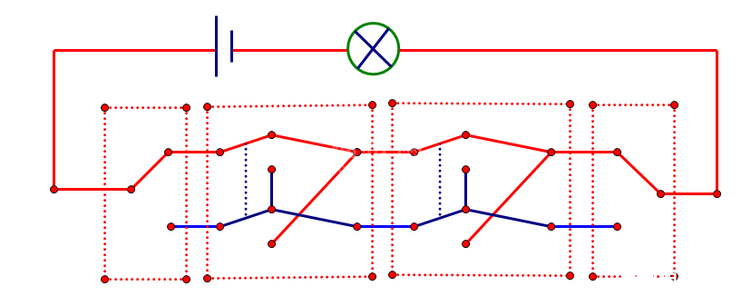很显然,第一种接法,天关不起作用,舍弃吧。第二种接法也应舍弃,因为此开关在当前状态下,前面的开关不管是接通了上面线路还是下面线路,经过此开关后都将接通上面线路,即此开关之前的开关对后面的线路不起作用了,也就对整个线路起不到控制的作用。那就只剩下最后一个种接法了,能实现吗?我们需要考虑两个因素:前面开关能否起作用,本开关能否起作用。前面开关的作用应是改变输入状态,此关的作用是在相同输入状态下改变输出状态,(以下四图用红色表示通电)