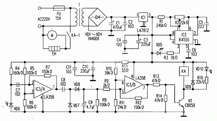 VD6为红外线接收管.接收VD5发射的红外光波信号。VD6接收到的红外光波信号通过电容器c7耦合至IC3A②脚,将电流信号变换为电压信号并进行前置放大。放大后的电压信号从其①脚输出,再通过电容器C8耦合至由二极管VD7、VD8组成的整流器整流及电容器C9滤波.在电阻器R8上形成二个直流电压信号。该信号经过隔离电阻R9耦合至IC3B⑤脚。进行直流放大。由⑦脚输出的直流信号经电阻器R13、R14分压,驱动控制三极管VT饱和导通。VT导通后.二极管VD10发光(显示工作状态):串联在其集电极的继电器KA线圈形成电流回路.KA工作.其触点KA-1闭合.电热管EH和吹风电机M同时得电.吹风电机将热风从出风口吹出。