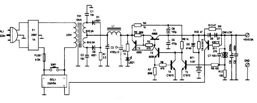 这时如果打开用电器的电源开关,负载电流增大到超过12.8mA,R13两端的电压降超过0.6V,T6便导通,BT1的电压就会通过T6的射、集极加到固态继电器SOL1的直流控制端的正极,始其导通,220V便加到TR1上,变压器次级的输出经过D1、D2整流,L1、C3、C4组成的π型滤波器平滑后,加到由T1~T5构成的集电极输出串联稳压电路上进行稳压,其输出的+6.2V电压一方面通过R10给BT1充电,另一方面通过D6、D7加到输出端上,经降落1.2V后输出+5V/0.5A的稳定电压。