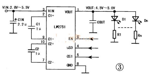 LM2751是美国国家半导体(NS)公司推出的一款小型白光LED驱动器,采用10PINLLP无铅封装,内置固定频率的电荷泵,在输入电压为2.8V~5.5V的情况下,可稳压输出4.5V或5.0V电压,输出电流为150mA(4.5V)或80mA(5V)。