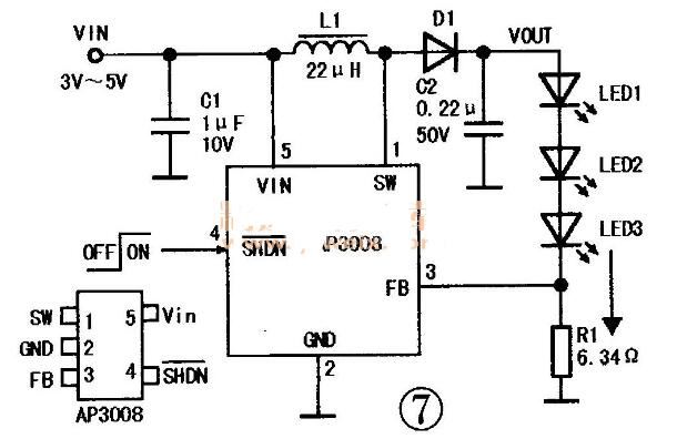 当输人电压为3.2V时,AP3008可以驱动4只白光LED,输出电流最大为20mA;当输人电压为5V时,它可以驱动6只白色LED、输出电流最大仍为20nA。AP3008采用SOT23-5和TSOT23-5封装,典型应用电路如图7所示。