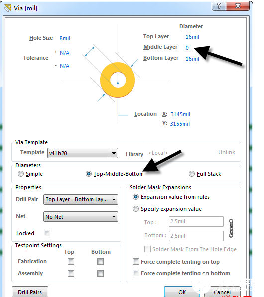 有时候为了增大内层的敷铜面积,特别是BGA区域,尤其在高速串行总线日益广泛的今天,无论是PCIE、SATA,还是GTX、XAUI、SRIO等串行总线,都需要考虑走线的阻抗连续性及损耗控制,而对于阻抗控制主要是通过减少走线及过孔中的Stub效应对内层过孔进行削盘处理。过孔的削盘处理如图1所示,双击过孔,设置其属性,选择“TOP-Middle-Bottom”模式,把内层焊盘的大小设置为“0”即可,多选择过孔的话可以批量处理。