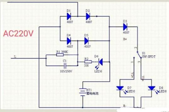 BT1是4V的蓄电池,S1为台灯的电源开关。电容C1及二极管D1、D2、D4、D5等组成一个简单的阻容降压充电电路,D6为充电指示灯。充电时AC220V经C1降压限流及二极管整流后给4V蓄电池充电。