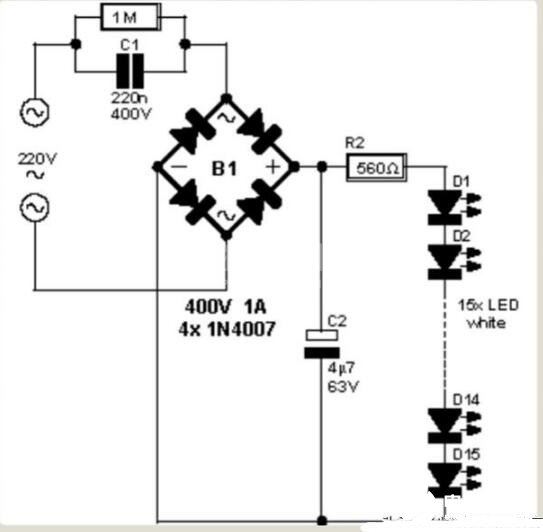该LED球泡灯内部由15个串联的白光LED灯珠组成,并采用简单的阻容降压电路来驱动这些串联的灯珠。由于每个白光LED灯珠的工作电压在3V左右,15个这样的灯珠串联,至少得有45V以上的电压才能使这些灯珠点亮。